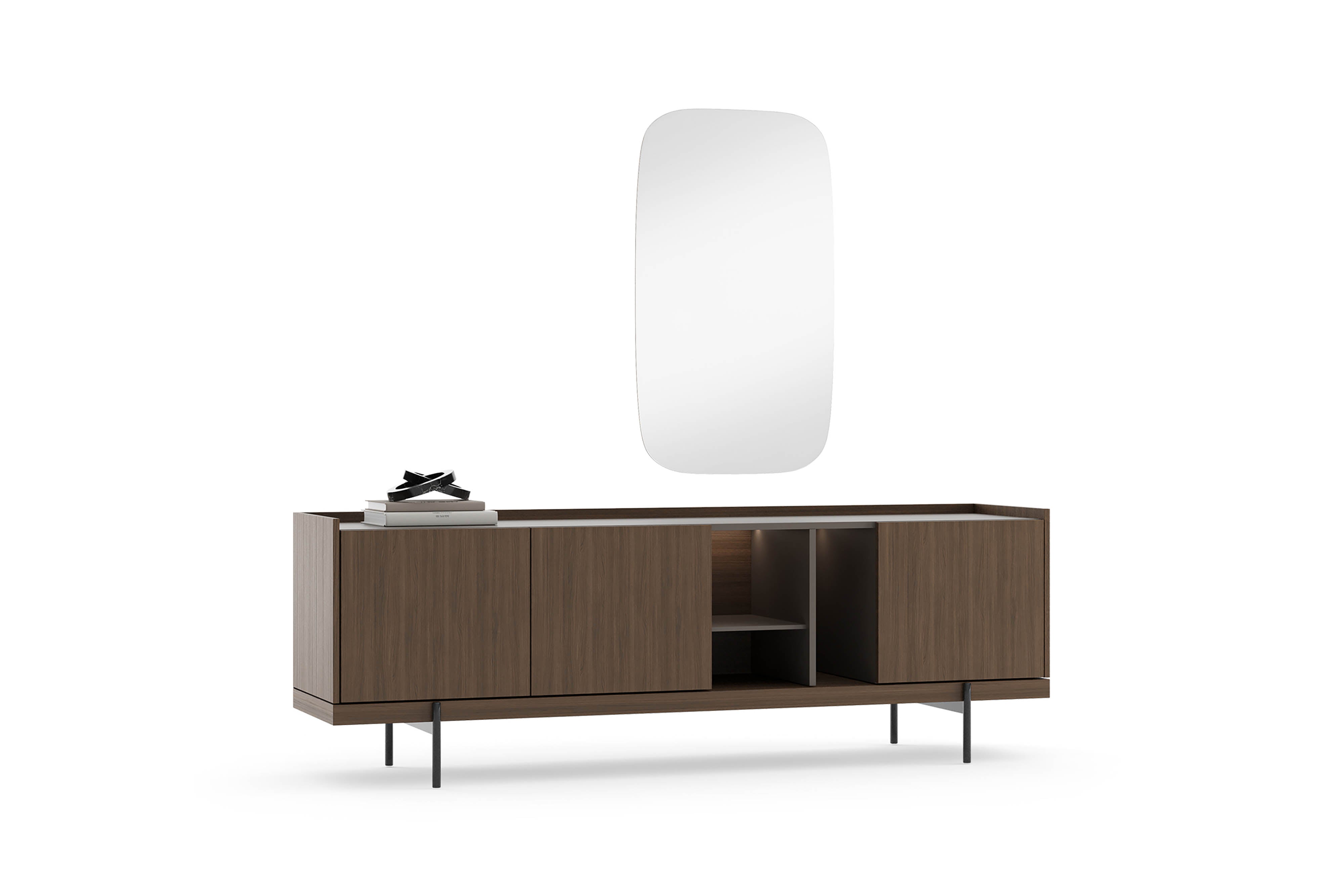 Het ontwerp bestaat uit gesloten kastdelen en een open middencompartiment met geïntegreerde verlichting. Hierdoor ontstaat een subtiel contrast tussen functionaliteit en design.