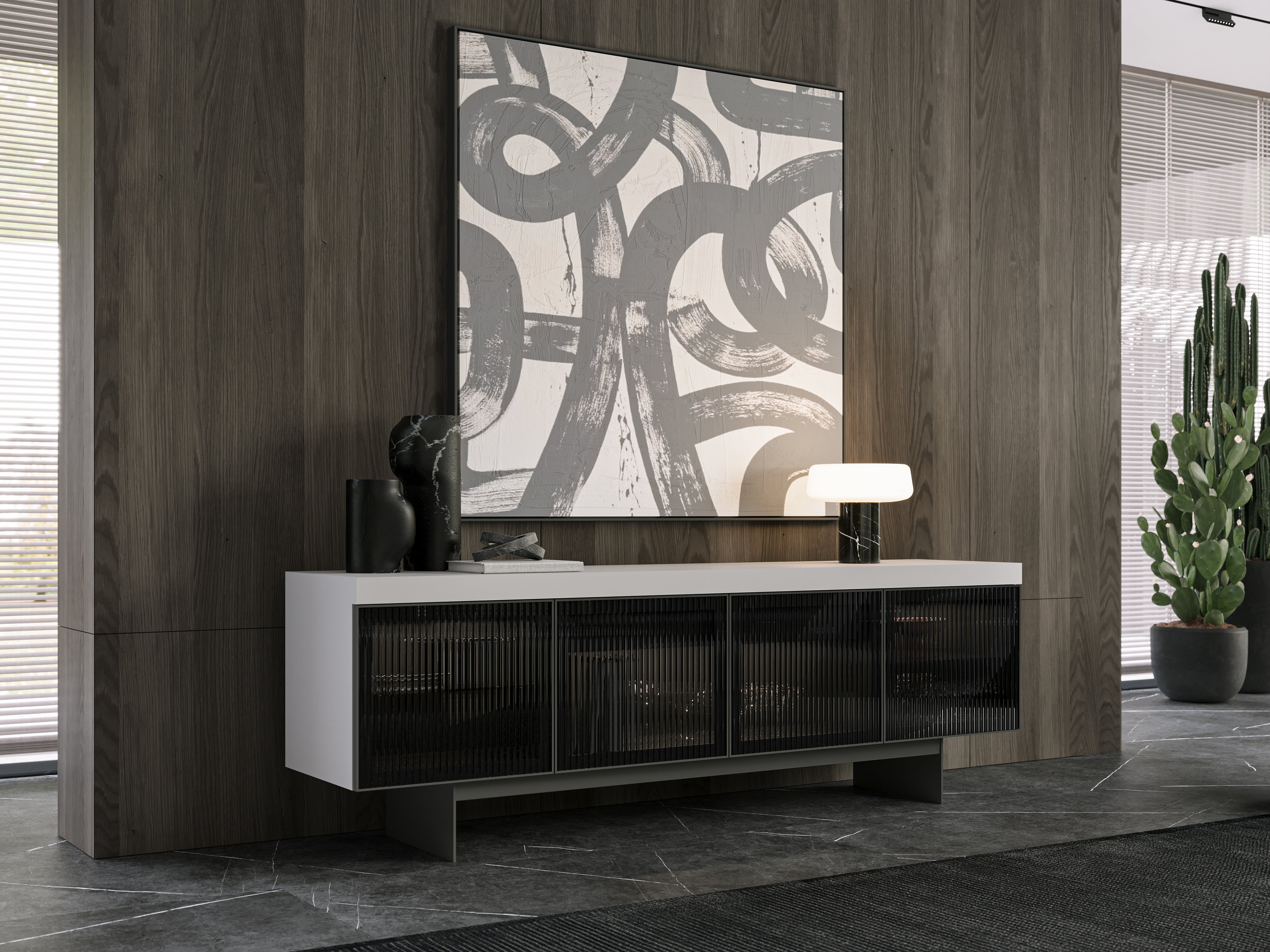 Modern design dressoir met warm hout en geribbeld glas voor een luxe en tijdloze uitstraling.