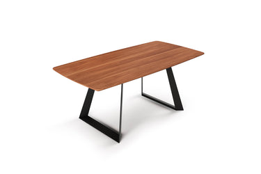 Moderne design eettafel met een elegant houten blad en een opvallend metalen onderstel. Een perfecte mix van stijl, comfort en duurzaamheid.