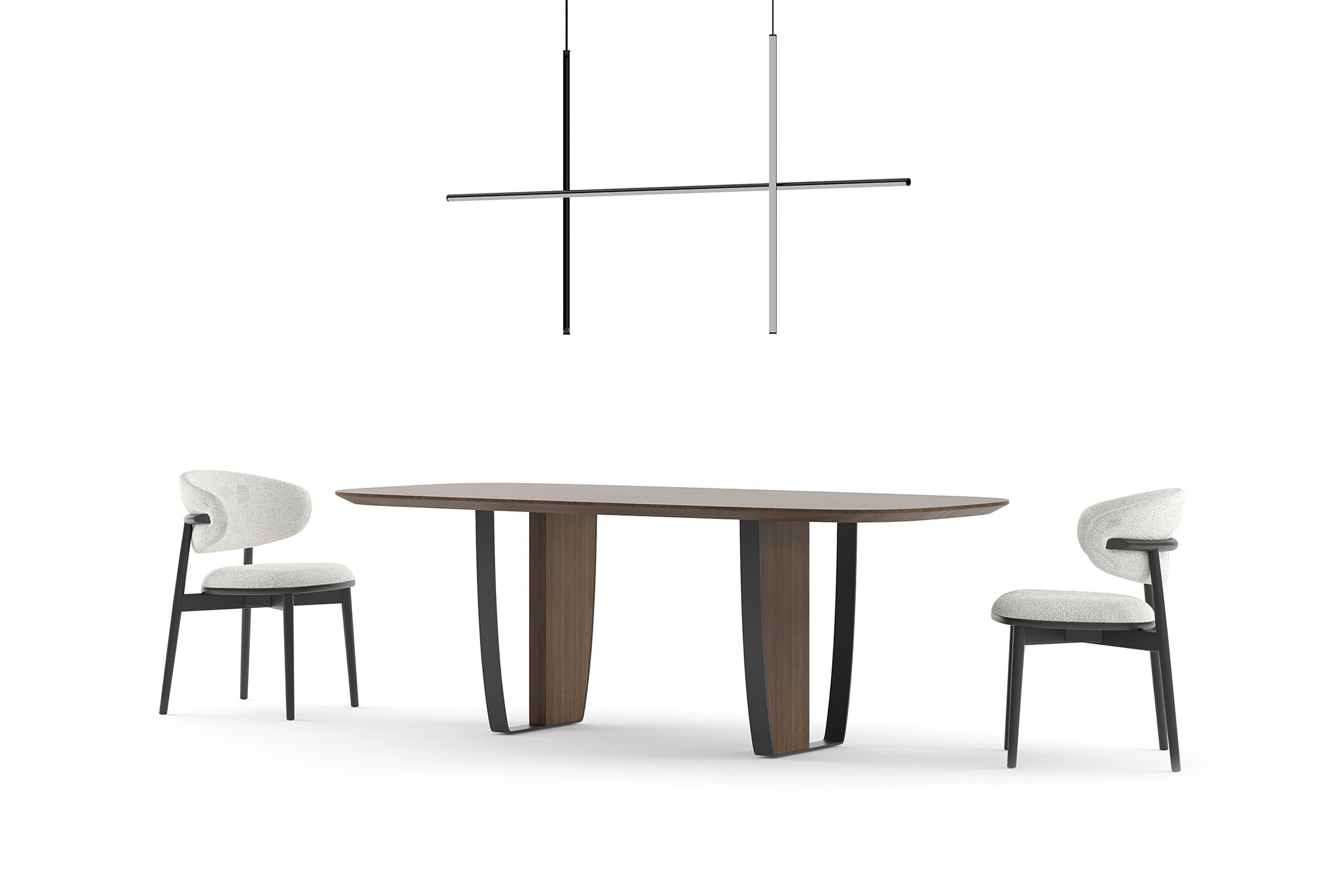 Design eettafel met organisch tafelblad en sculpturaal onderstel in hout en metaal.