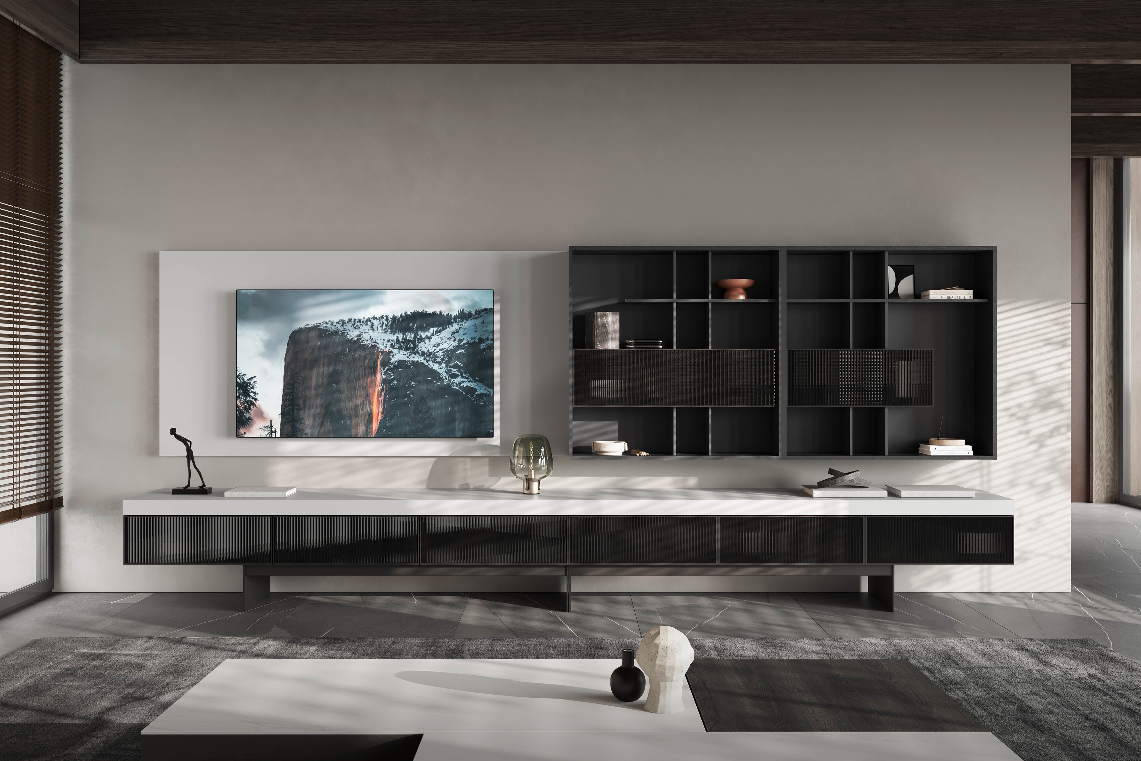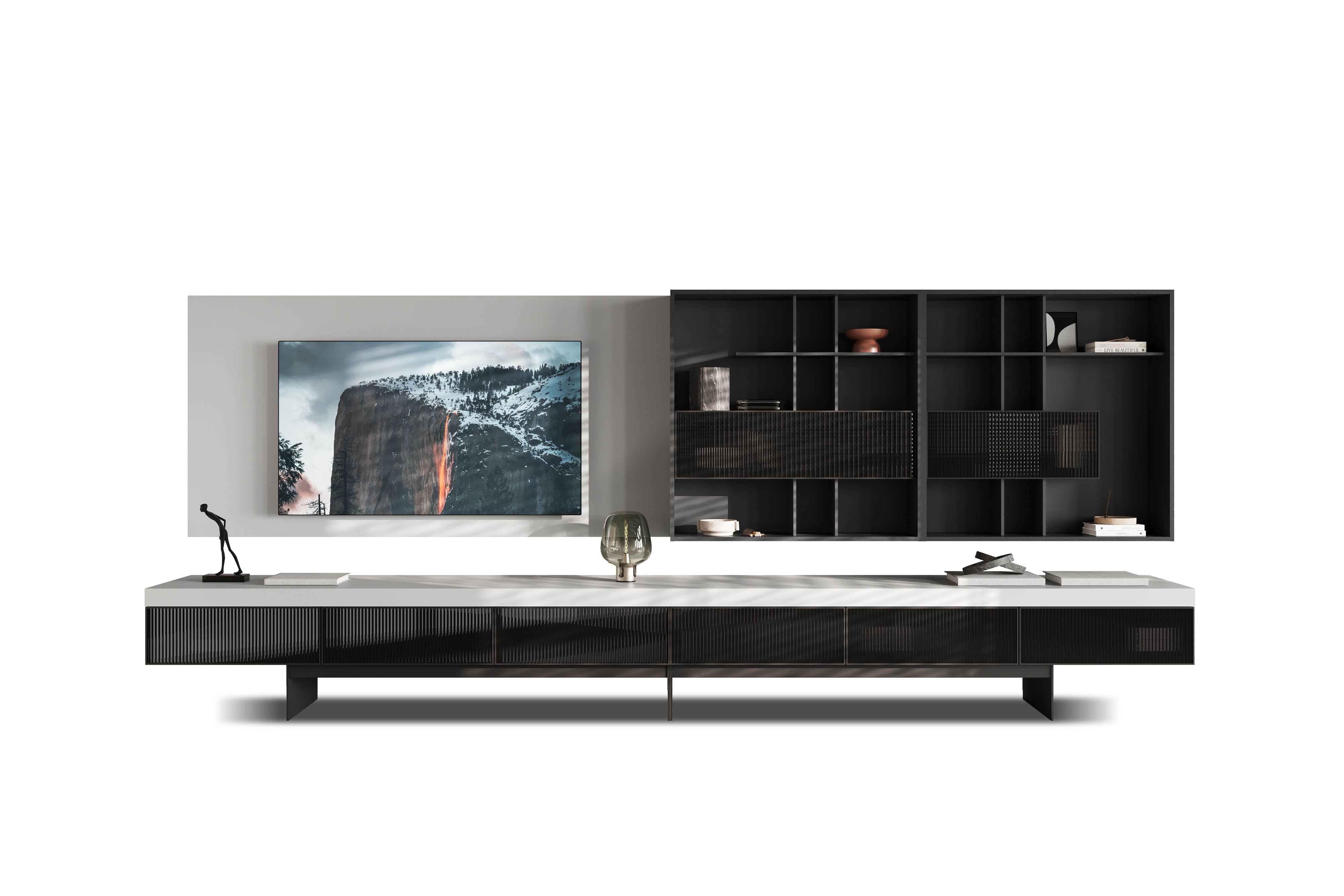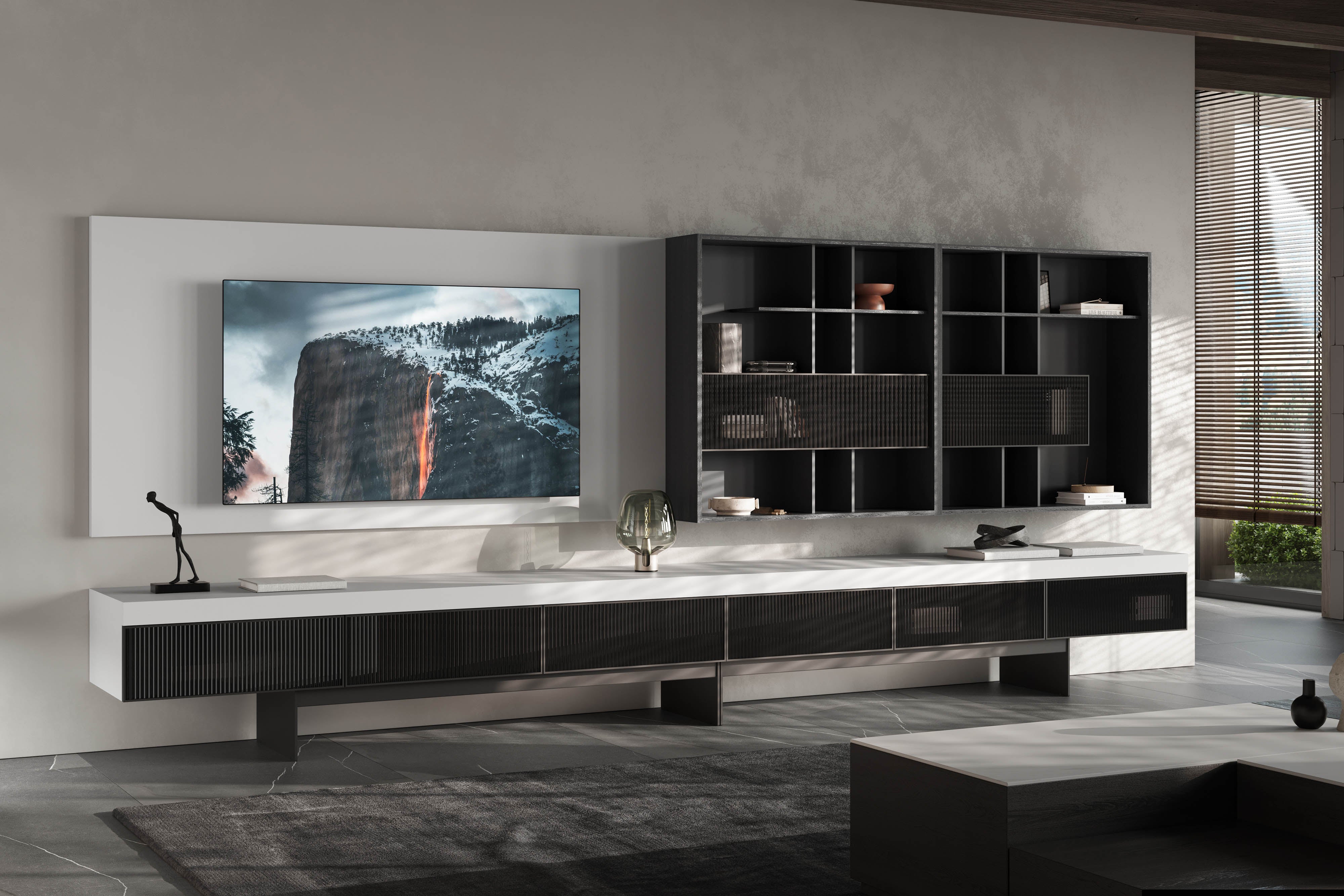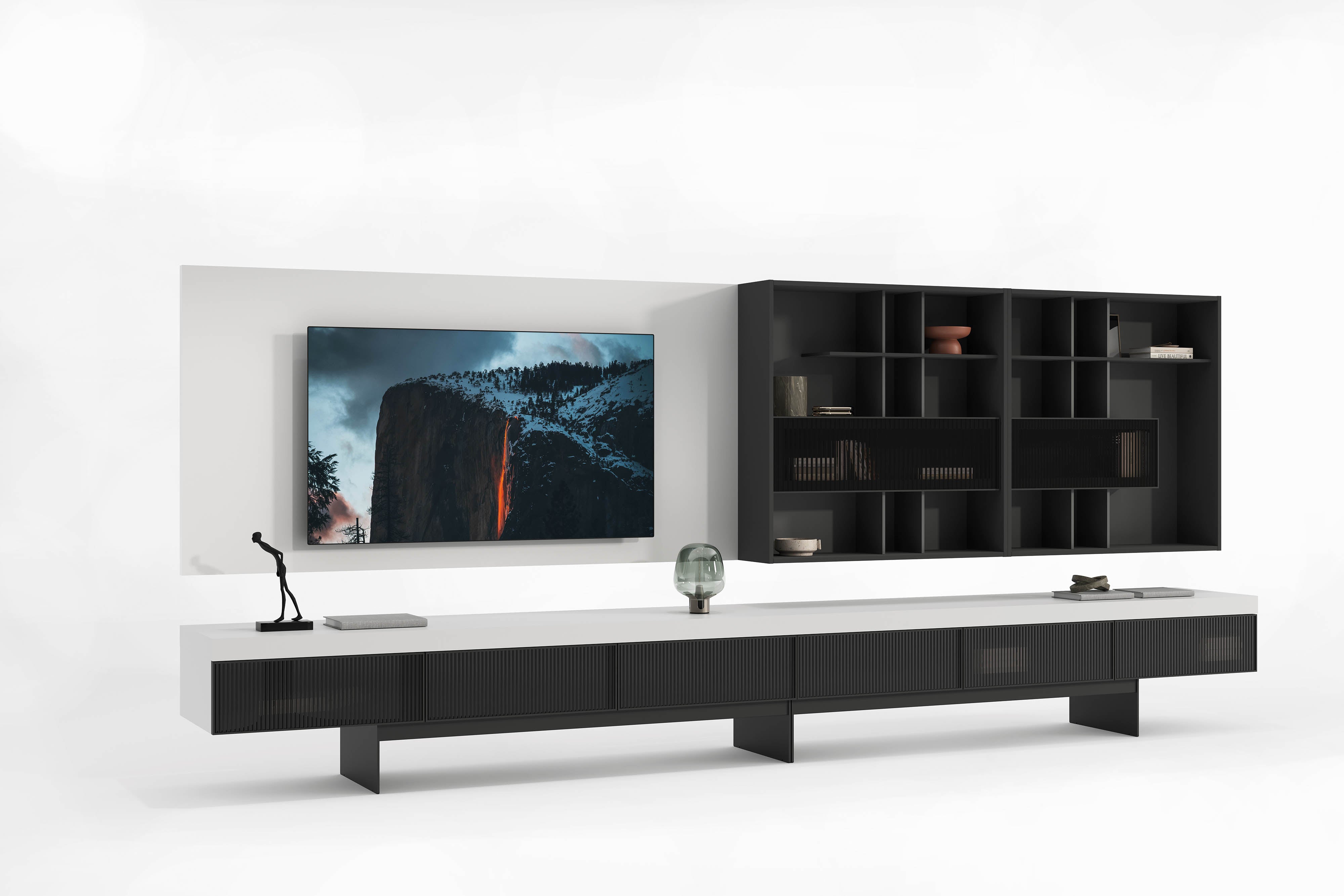 Moderne tv-meubel met wandpaneel, open vakken en geribbelde glazen deuren.