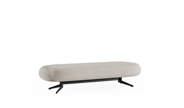 De Bon Bon Bench combineert zachte rondingen met een krachtige, architecturale basis. Het langwerpige, afgeronde zitkussen rust op een minimalistisch metalen onderstel, waardoor een subtiele balans ontstaat tussen comfort en design.
