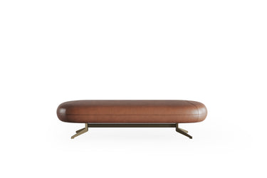 De Bon Bon Bench combineert zachte rondingen met een krachtige, architecturale basis. Het langwerpige, afgeronde zitkussen rust op een minimalistisch metalen onderstel, waardoor een subtiele balans ontstaat tussen comfort en design.