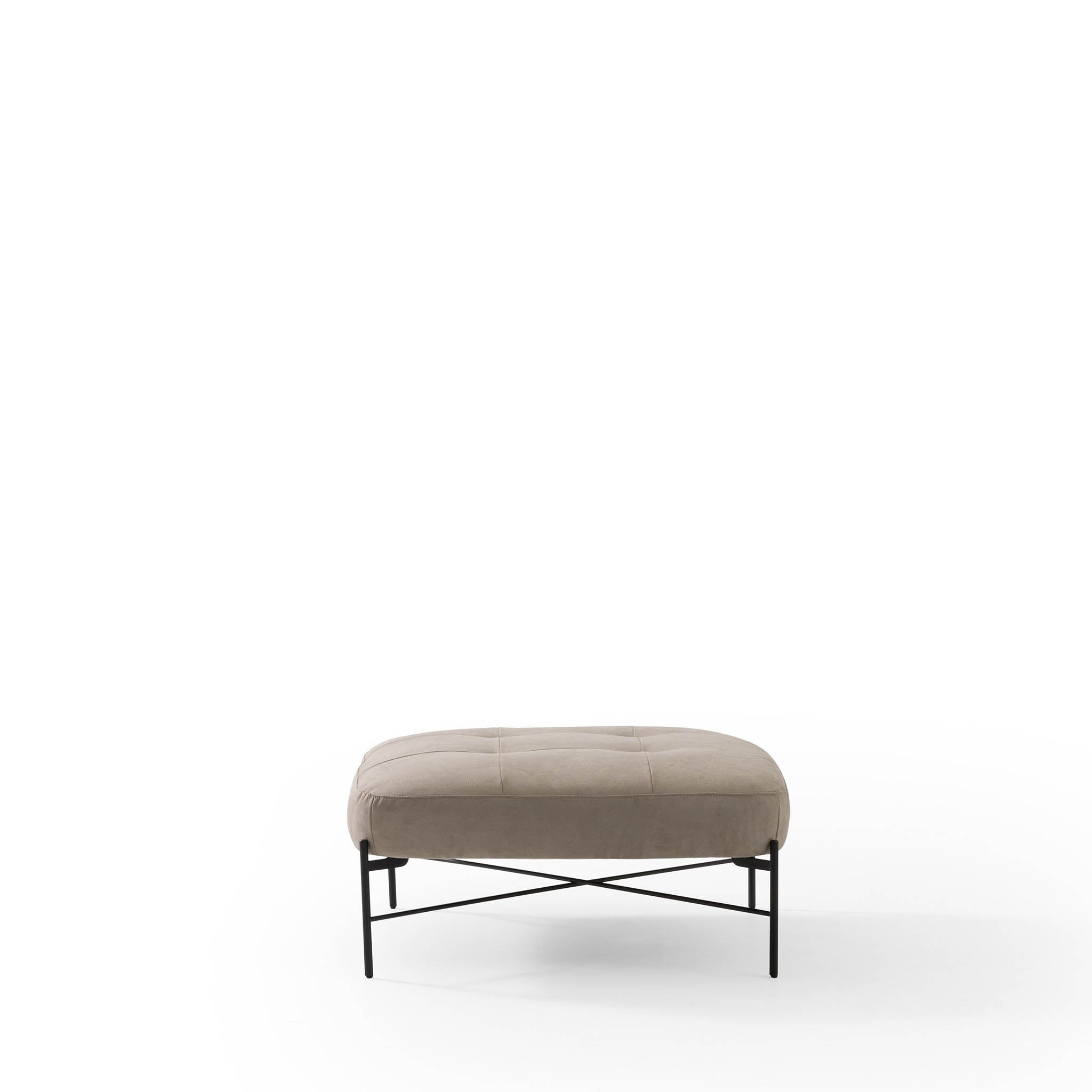 De Thor Pouf is een krachtige combinatie van comfort en architecturale finesse. Het royale, zacht gestoffeerde zitvlak rust op een minimalistisch metalen onderstel met kruisspijlen, wat zorgt voor stabiliteit én een verfijnde, luchtige uitstraling.