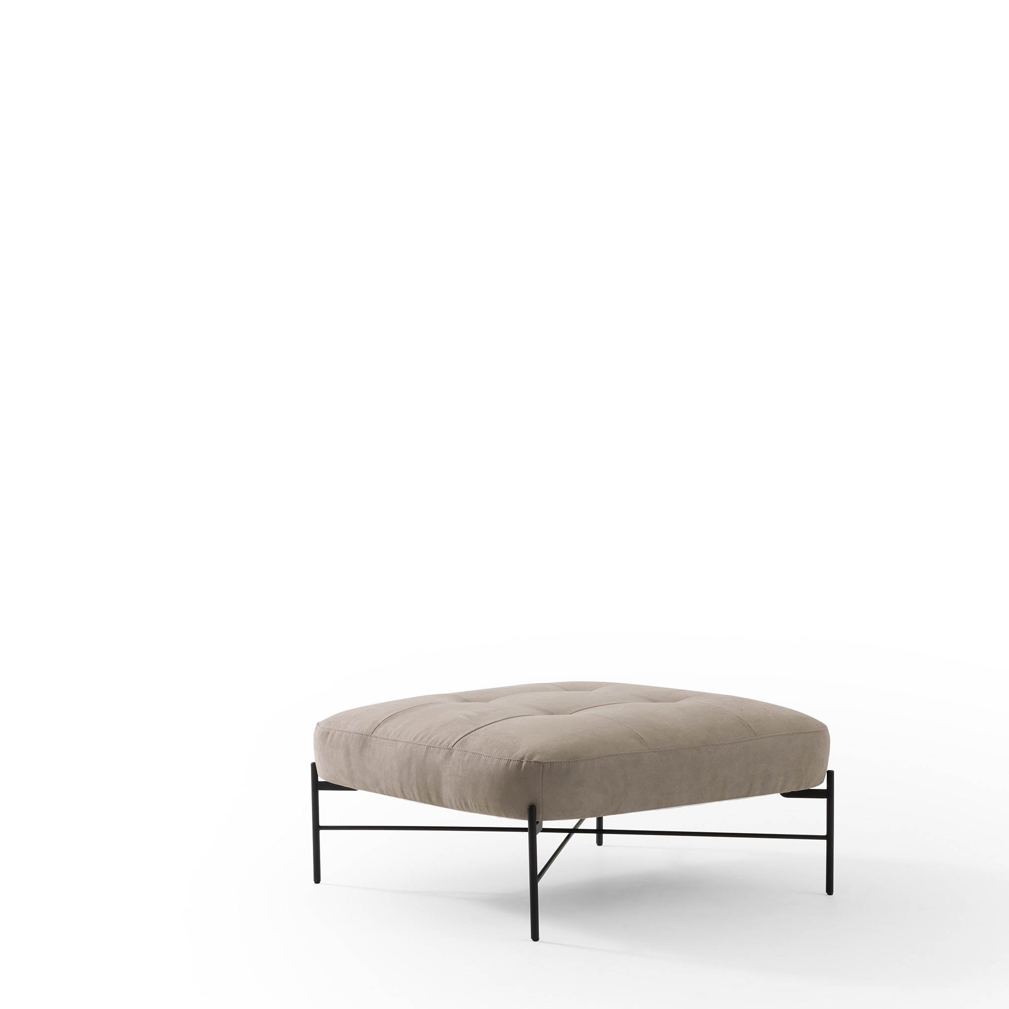 De balans tussen het volumineuze kussen en het slanke frame creëert een moderne, industriële elegantie. Dankzij de verhoogde constructie oogt de pouf visueel licht, terwijl hij toch een sterke aanwezigheid heeft in de ruimte.
