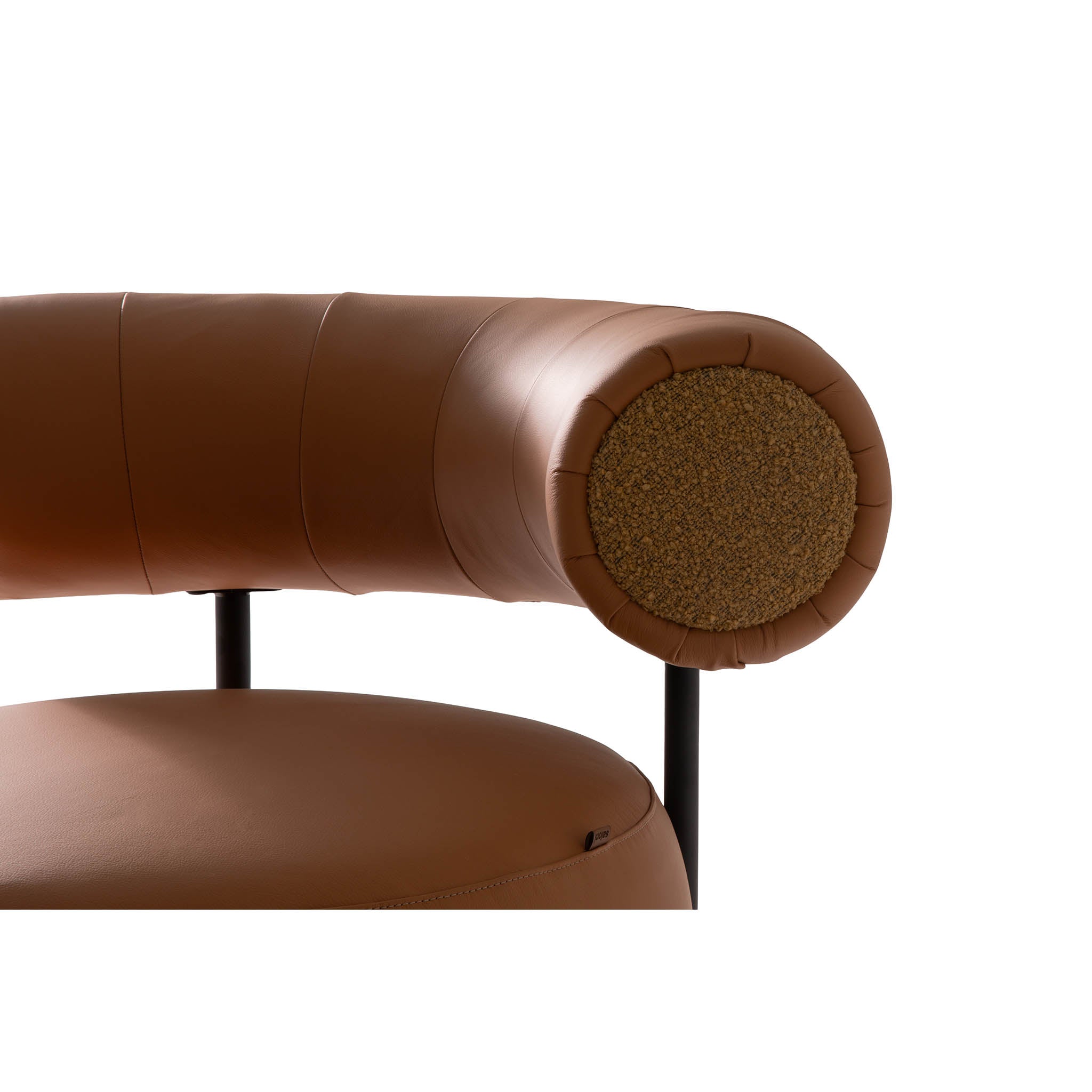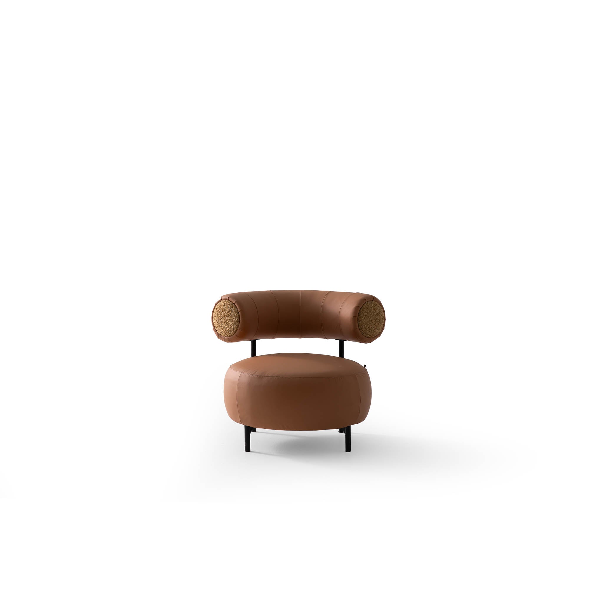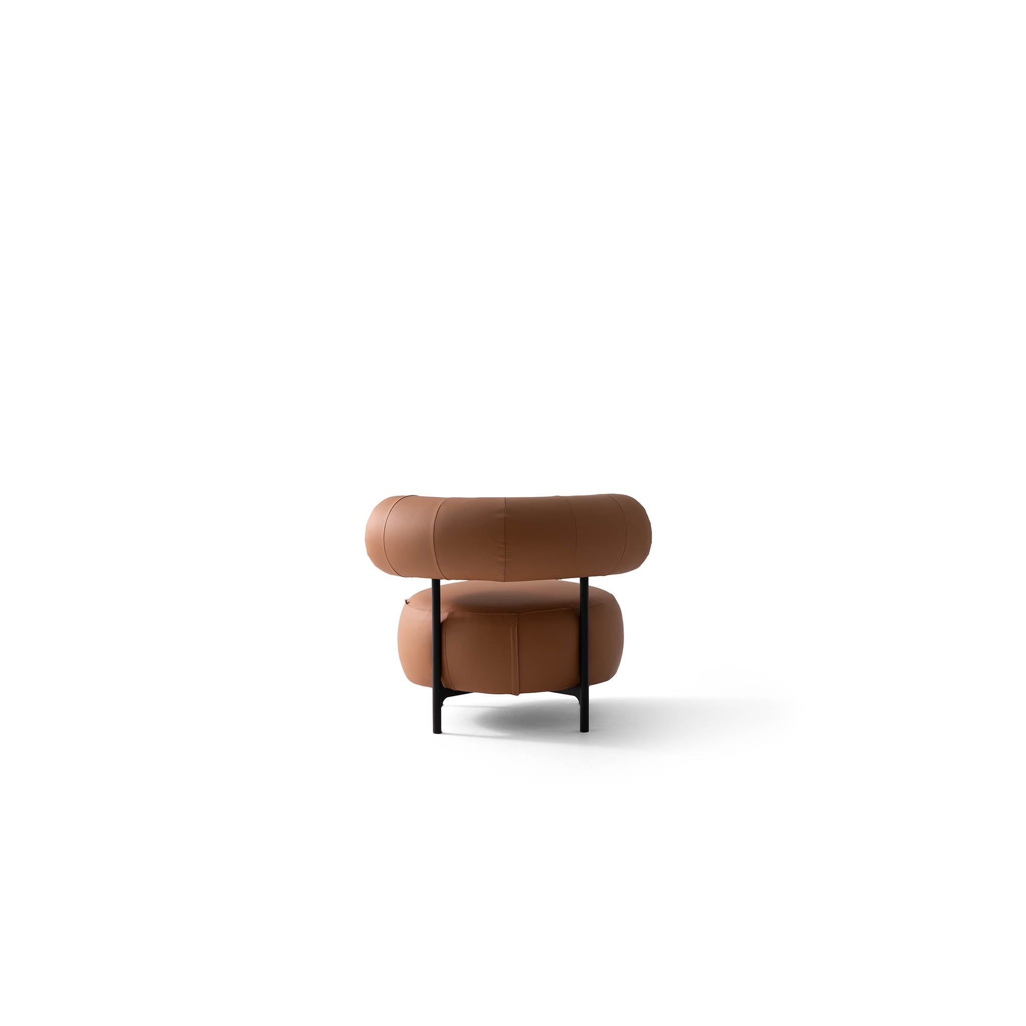 De combinatie van warm cognackleurig leer en het minimalistische zwarte metalen frame zorgt voor een krachtig contrast. De afgeronde vormen creëren een geborgen zitgevoel, terwijl het stevige onderstel stabiliteit en duurzaamheid garandeert.