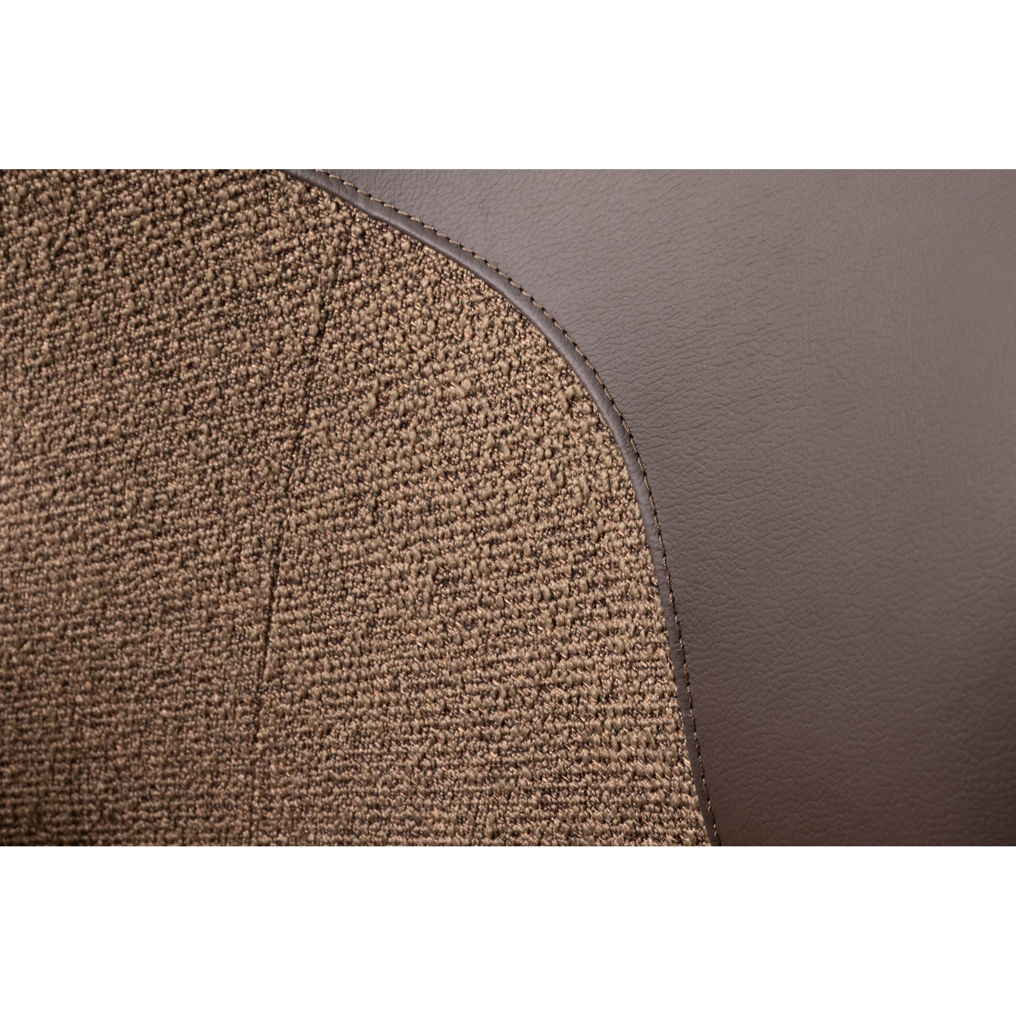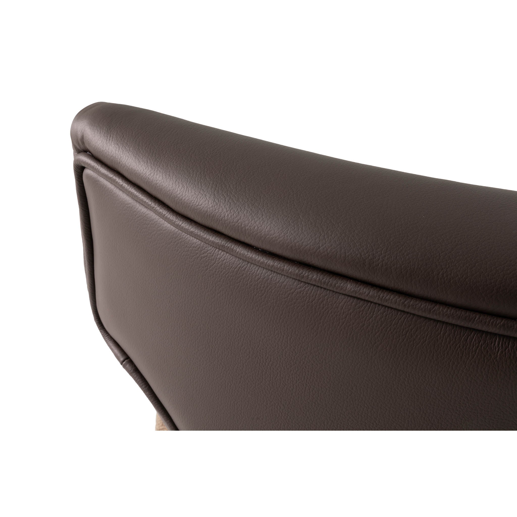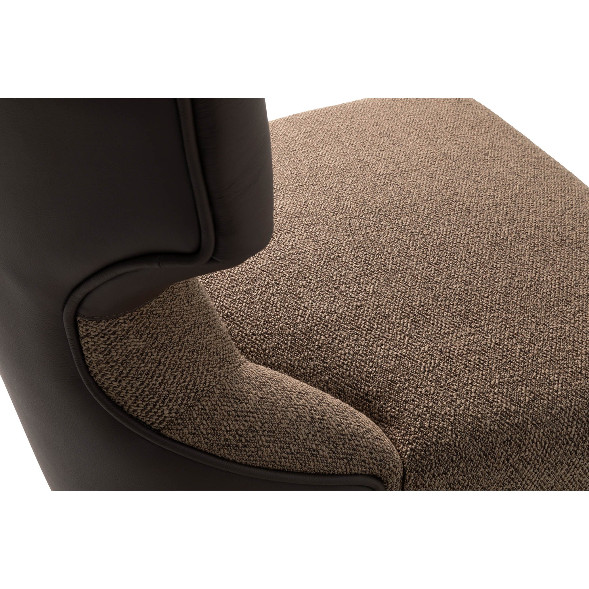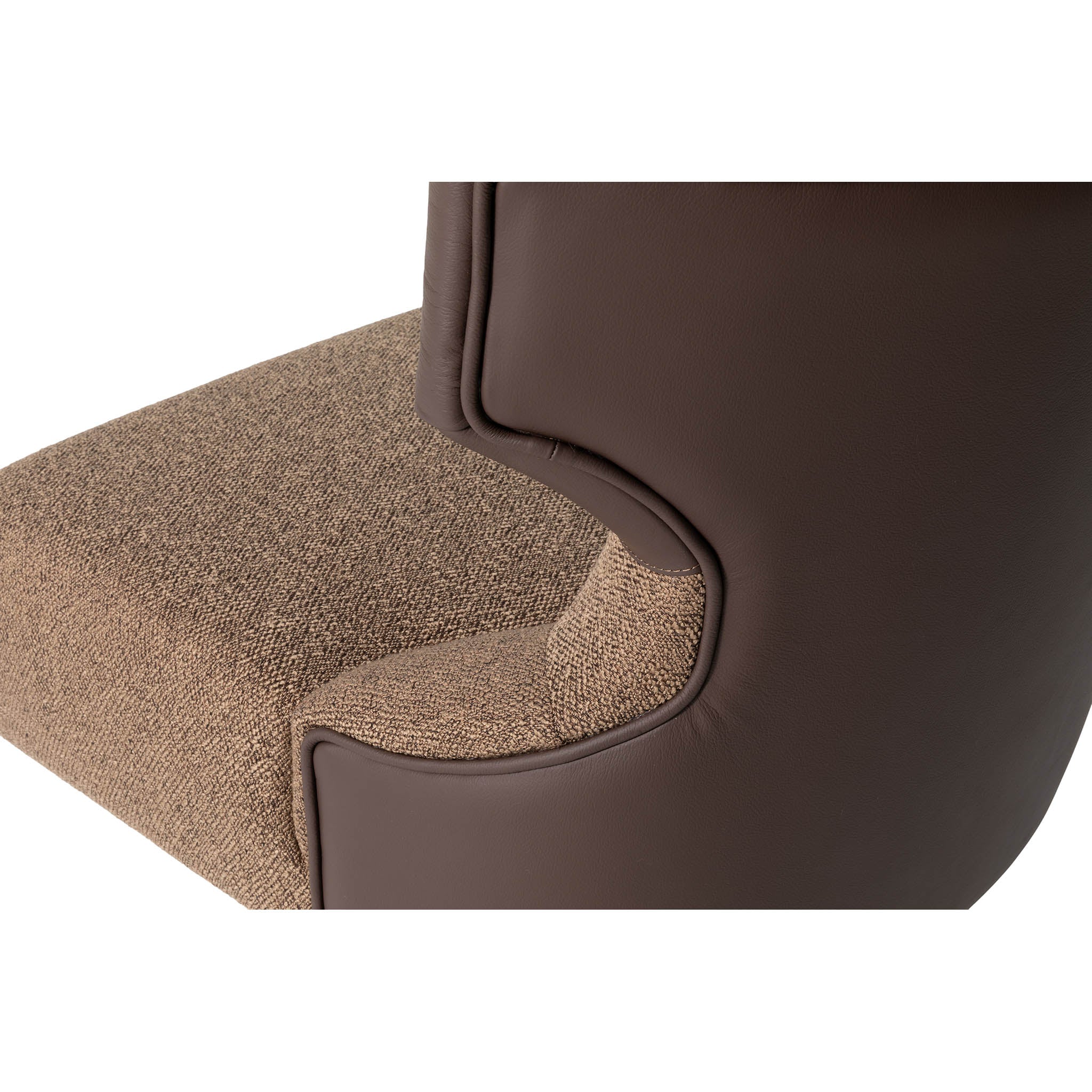 De buitenzijde is elegant bekleed met hoogwaardig leder, terwijl de zitting en binnenzijde zijn uitgevoerd in een rijke, textuurvolle bouclé stof. Deze combinatie zorgt niet alleen voor een visueel contrast, maar ook voor een warm en uitnodigend zitgevoel.