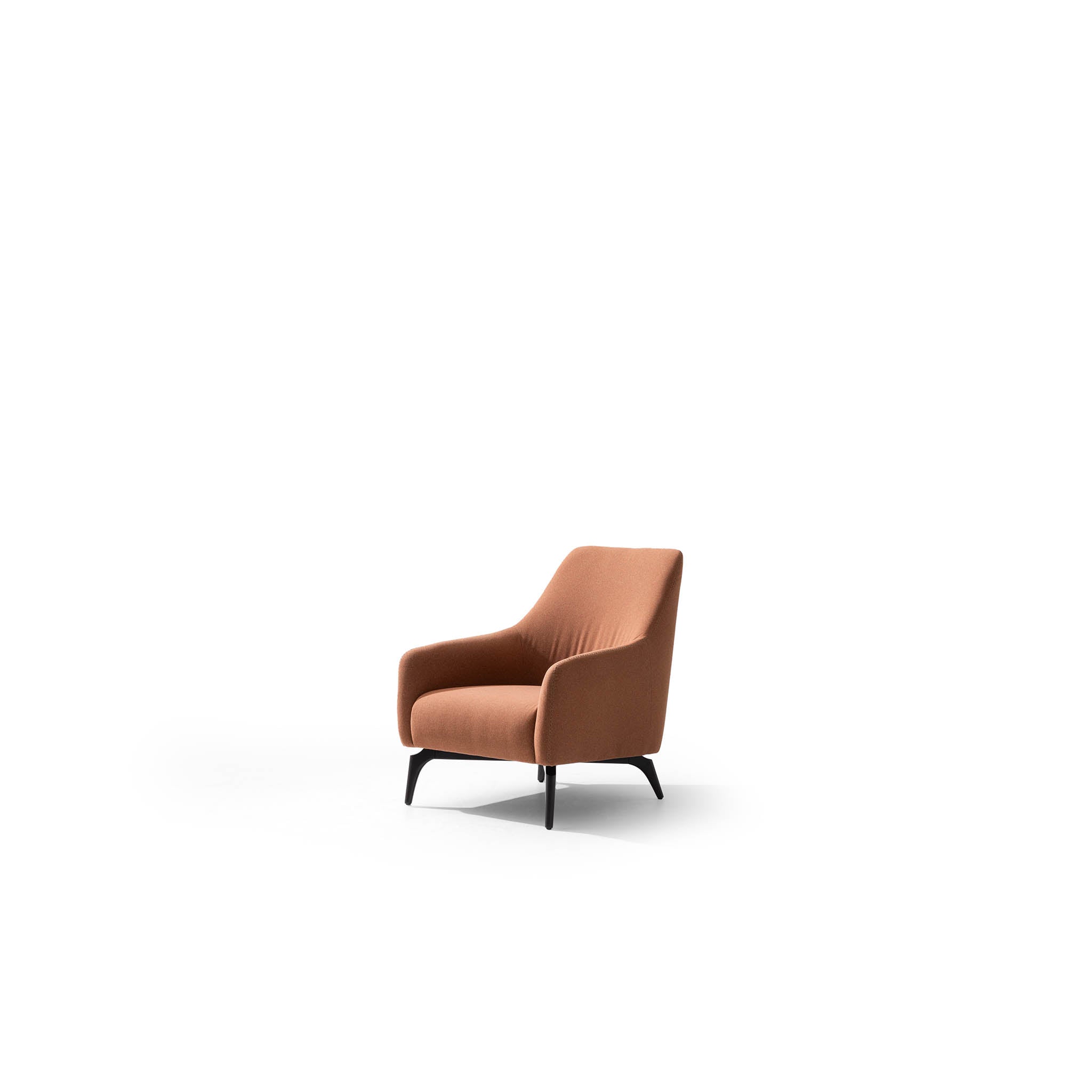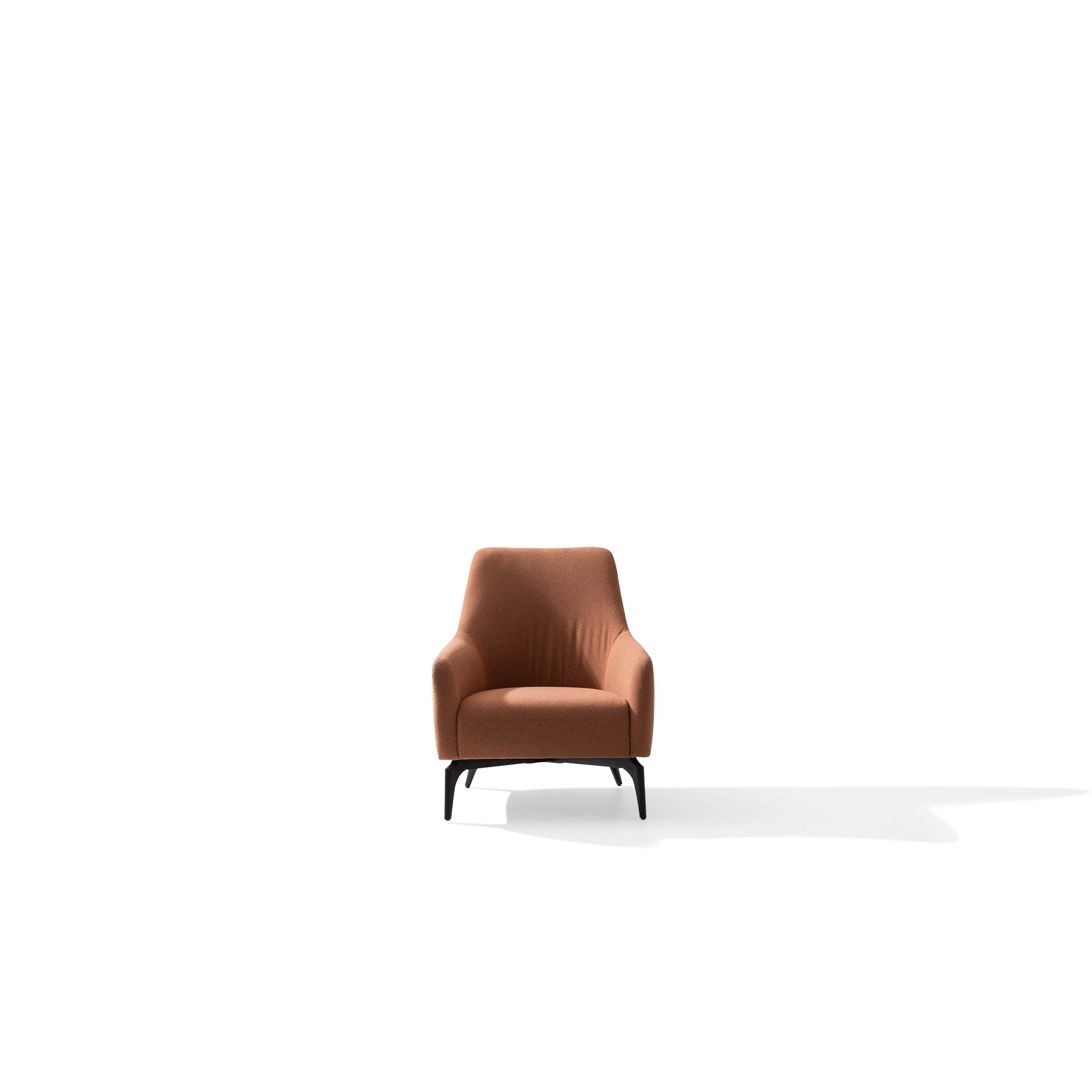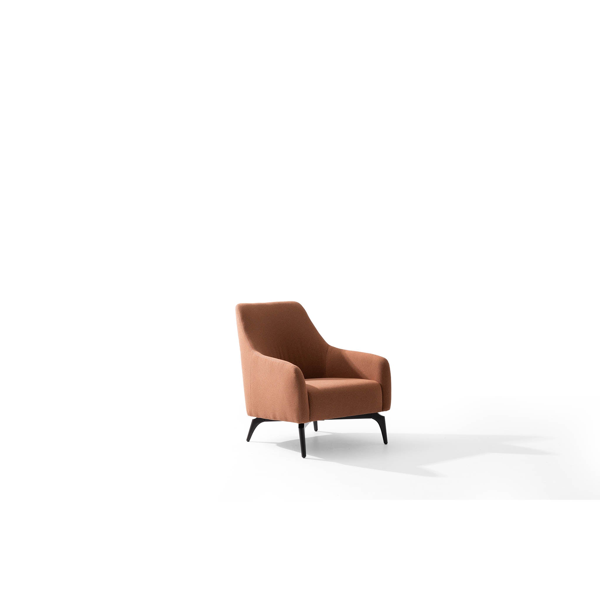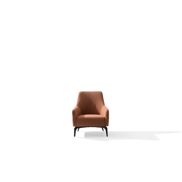 De fauteuil is bekleed met een hoogwaardige, zachte stof in een warme terracotta tint. Deze kleur brengt warmte en karakter in de ruimte en laat zich prachtig combineren met natuurlijke materialen zoals hout, marmer en metaal.
